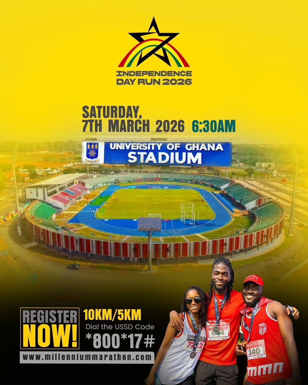 The starter’s pistol will fire at 06:30 GMT, sending runners on a course that culminates at the University of Ghana Legon Sports Stadium.